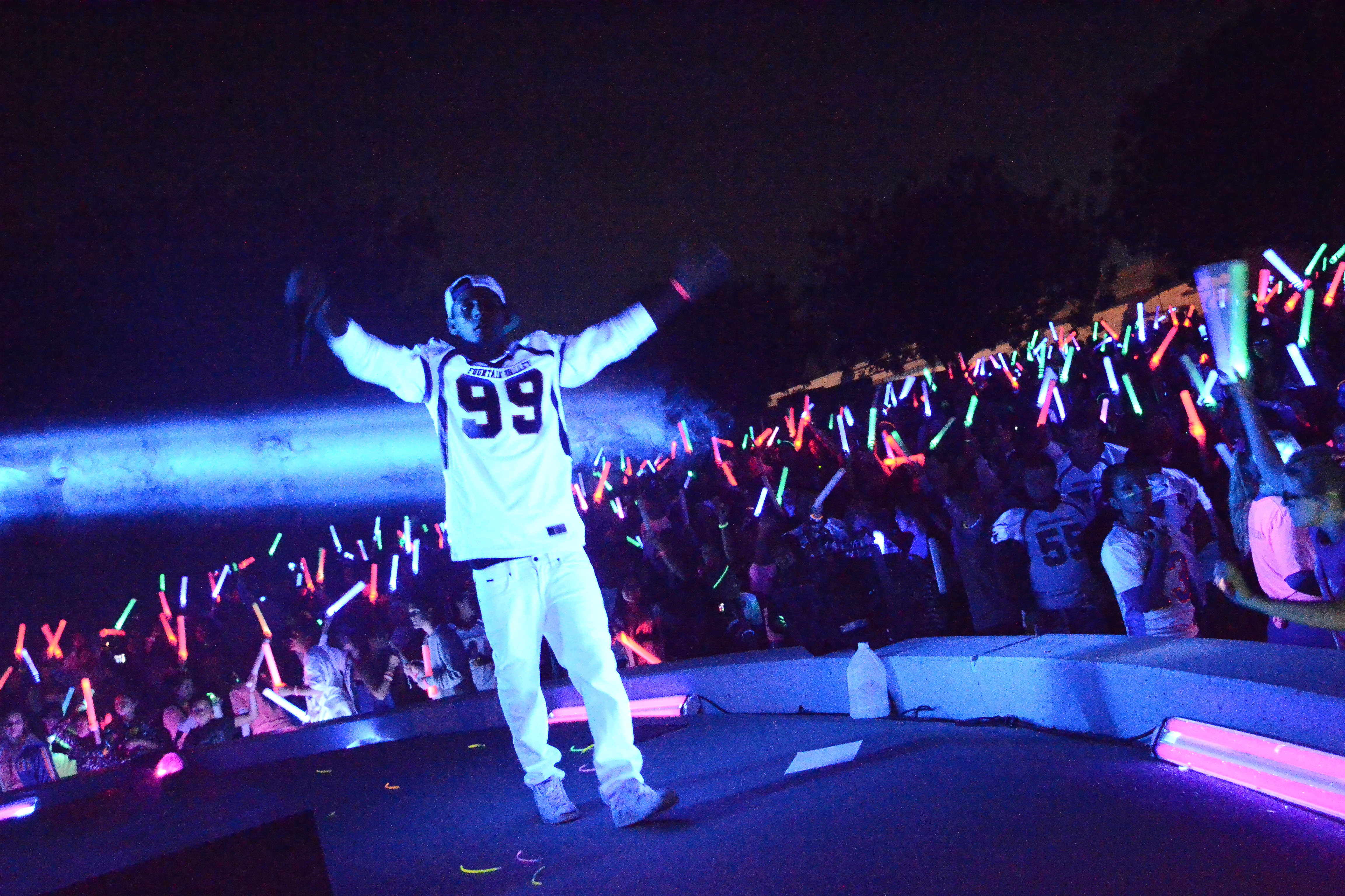 Then this year Mr. Fraser successfully implemented our first “Glow Show.” It was a night time pep rally before our big rivalry game. We had well over 1,500 students and parents show up on a THURSDAY night to cheer on the football team and it was spectacular.