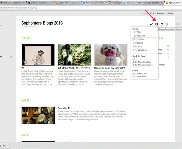 So FEEDLY basically takes all of the magazine and blogs you follow online and allows you to put them in categories, view them by publication date, mark read, save for later etc… it’s pretty awesome. I use my FEEDLY to follow my student blogs. You can read them here: http://reframedexperience.wordpress.com/