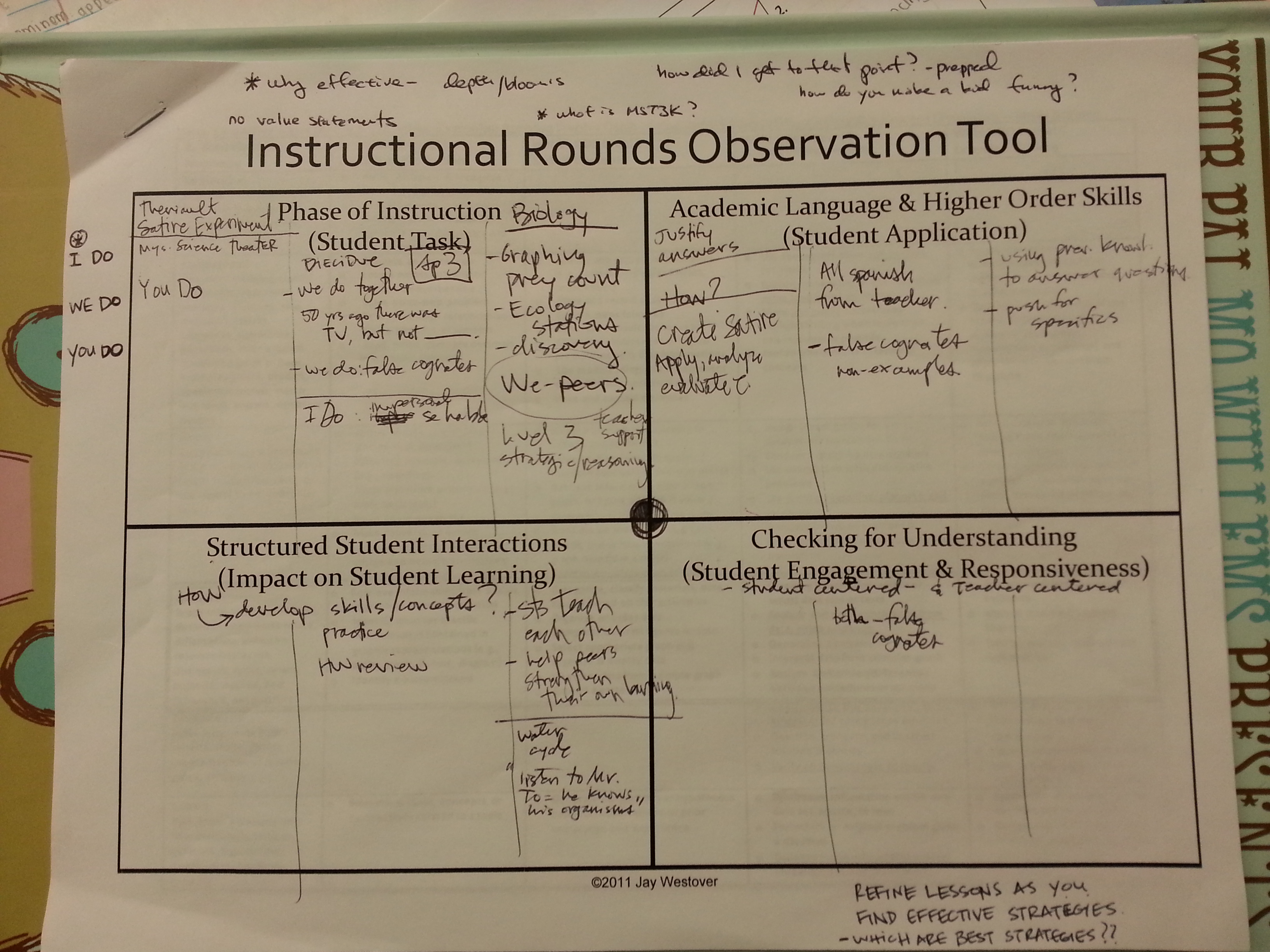 On Monday teachers and admin from various schools in our district (including our District Director of Curriculum) were going to attend a half-day training on Instructional Rounds in our Library. Sean asked if they could stop by my room for an observation. Three groups of five to six teachers would be entering my room every fifteen minutes to objectively take notes on what they saw so that they could get in post-observation groups to discuss effective strategies.