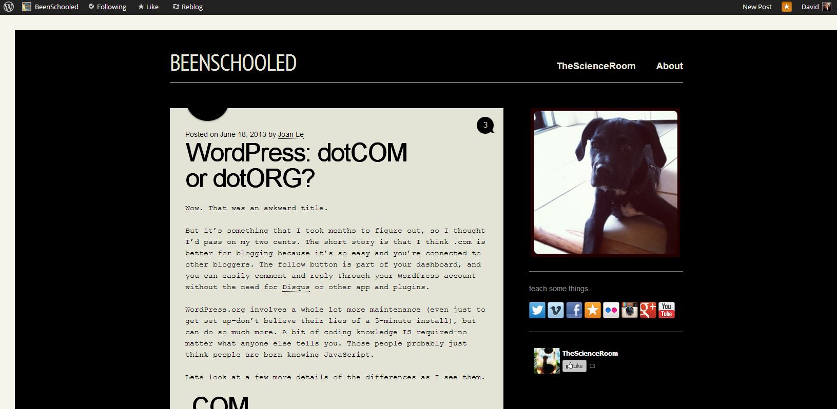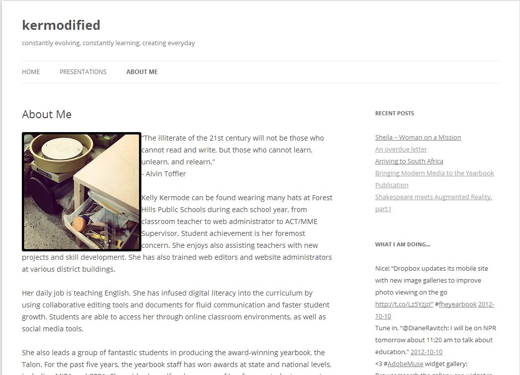 As of now the Internet is free. (I hope it stays that way) Buying your own domain is as expensive as a Starbucks run and yet when you drop that money on the counter and walk away with your own innovation space a whole world of possibilities wait outside that door. I have two big projects lined up, just waiting to emerge from my dreams. They will both be wordpress.org sites with their own identity where I can play, dismantle, add, fix, explore to my hearts content. It will be a place where I and my students can LEARN: an innovation space: A “Low Road” to call our own.