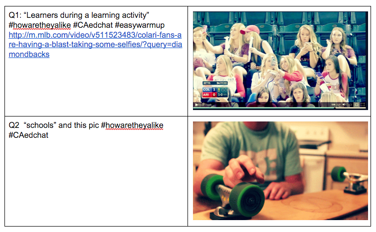 Why did a similar activity with a recent Twitter #CAedchat chat. We called it “How Are They Alike.” You could not only do this activity in our classroom, but you could do this during a Professional Development activity with your staff.