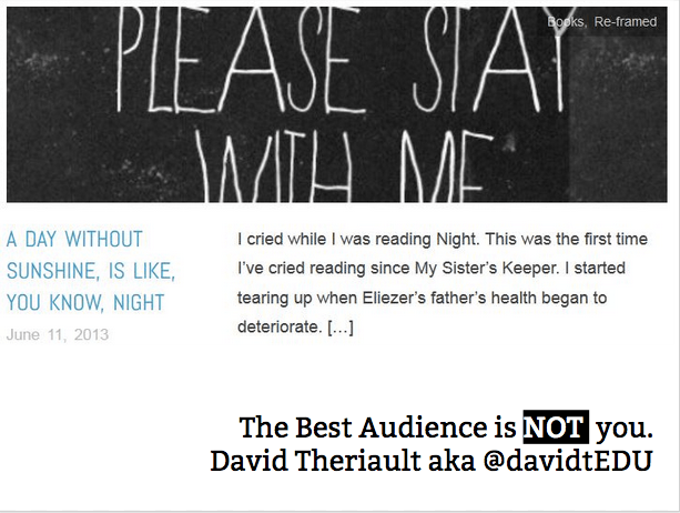 David Theriault (Me): Here is the article that explains the RE:Framed Blogging Project . Here is the Pinterest Board for my current student blogs and here is an example of how my students share their blogs in class. Use #cloudwriting on Social Media whenever you or your students share their blogs. Thanks.